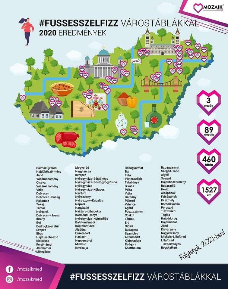 - #fussésszelfizz: A játék szlogenje „ FUSS minél többet az egészségedért és a futások alatt SZELFIZZ a települést jelző táblával.” A célja az volt, hogy motiváljuk az adott település futóit, hogy minél többen fussanak a városban és töltsék fel a saját várostáblás képeiket. A verseny során 1526 km gyűlt össze, 3 országból, 89 település versenyzett (köztük 6 külföldi) és 460 település táblát sikerült beküldeni nekünk. Legtöbb kilométert futotta augusztus 6-20. között Réla Attila 190 km, Szabó István Zoltán 181 km és Kádár Tamás 125km.